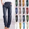 Damen Sommerhose aus Baumwollleinen mit weitem Bein, lässig, locker, Kordelzug, hohe Taille, Palazzo-Hose mit Taschen