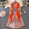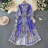 Vintage Langes Kleid für Damen, Frühling, Herbst, Blumendruck, Robe, Stehkragen, elegant, einreihig, Schnürgürtel, plissiertes Maxikleid