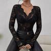 V-Ausschnitt Fächerförmiger Kragen Einlagiges Einfarbiges Langarm-T-Shirt Aus Spitze Slim Fit Schlankmachendes Oberteil Für Damen T-Shirts Damen