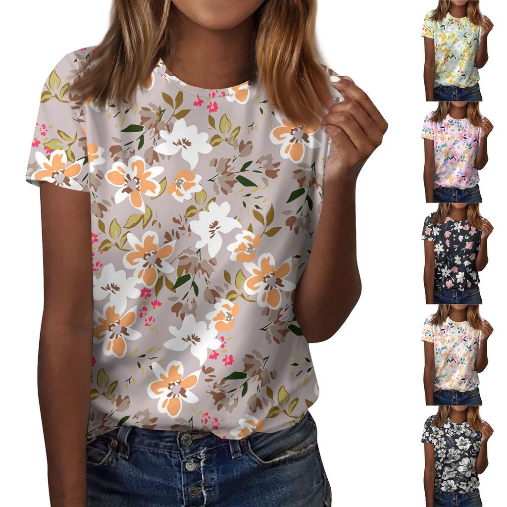 Kurzärmliges T-Shirt mit Rundhalsausschnitt für Damen, modisches T-Shirt mit Blumendruck, lässiges Oberteil, schulterlanges Kurzarmoberteil