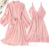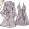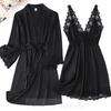 Schwarzer Spitzenbesatz 2-teiliges Nachthemd-Set für Frühlings- und Sommerfrauen, Nachtwäsche, Nachthemd, sexy Bademantel, Unterwäsche, lose Satin-Hauskleidung