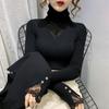 Samt Flor Stehkragen Mesh Aushöhlpullover Herbst und Winter Spitze Spleißen Slim Strick Basic Pullover Damen Oberteil