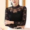 WTEMPO Transparente Spitzenoberteile, Langarm, Freizeithemd, Rollkragen mit Perlen, feminine Oberteile, sexy, schmale Spitzenbluse, Gestrickte Oberteile