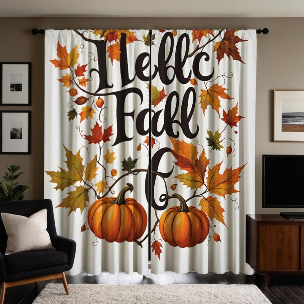 2er Set HD Thanksgiving Gelber Kürbis und Ahornblatt Dekovorhang Weißes Band Digital bedruckter Vorhang Wohnkultur Stil