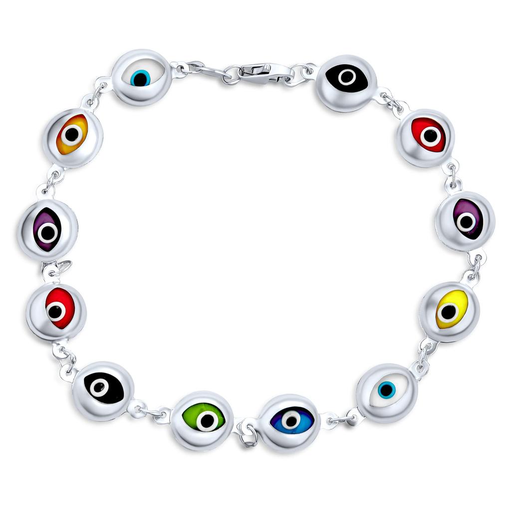 A playful take on spiritual jewelry and protection against bad luck, this beautiful and lightweight Design Link Evil Eye Bracelet features an array of multicolored radial rainbow eyes in vibrant primary color hues. It gives you a sense of the mystery of the East. For centuries, ancient cultures have looked to evil eye jewelry to ward off bad luck and attract good karma. This accessory is also perfect as a gift.