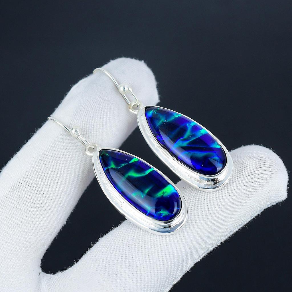 Dunkelblaue Triplett Feueropal Edelstein Ohrringe, 925 Sterlingsilber Ohrringe, Handgefertigter Boho Silberschmuck Hängeohrringe, Muttertagsgeschenk