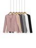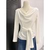 Unregelmäßig plissiertes, schräges Hals-Mode-Basisshirt für Damen im Winter, neues T-Shirt-Design und Oberteil mit Kordelzug in der Taille