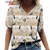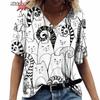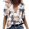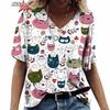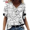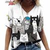 Anime Katzen-Print Damen T-Shirt 2024 Mode Harajuku Kleidung V-Ausschnitt Übergroß Kurzarm T-Shirts Damen Casual Streetwear Bluse