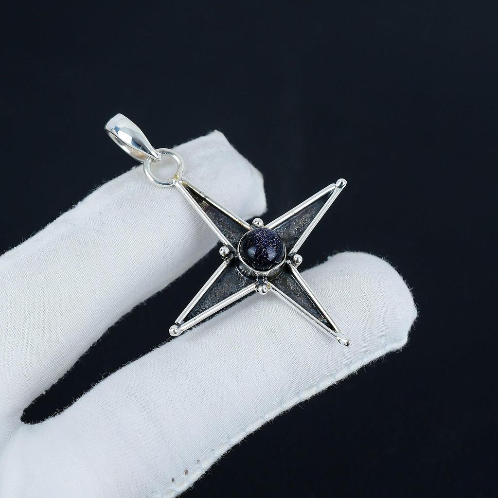Blauer Sonnenstein Edelstein Silberanhänger in 925 Sterlingsilber - Handgefertigtes Stern-Design, Alltagsschmuck, Einzigartiger Kunsthandwerklicher Designanhänger Geschenk