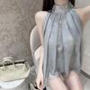 Graue Puppenkragen Weste mit Hosenträgern für Damen Frühling Neues Design Locker Chiffon Bauch Ärmelloses Top