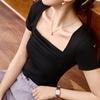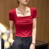 T-Shirt mit eckigem Ausschnitt für Damen Sommer Kurzarm Schulter vorne Slim Body Style