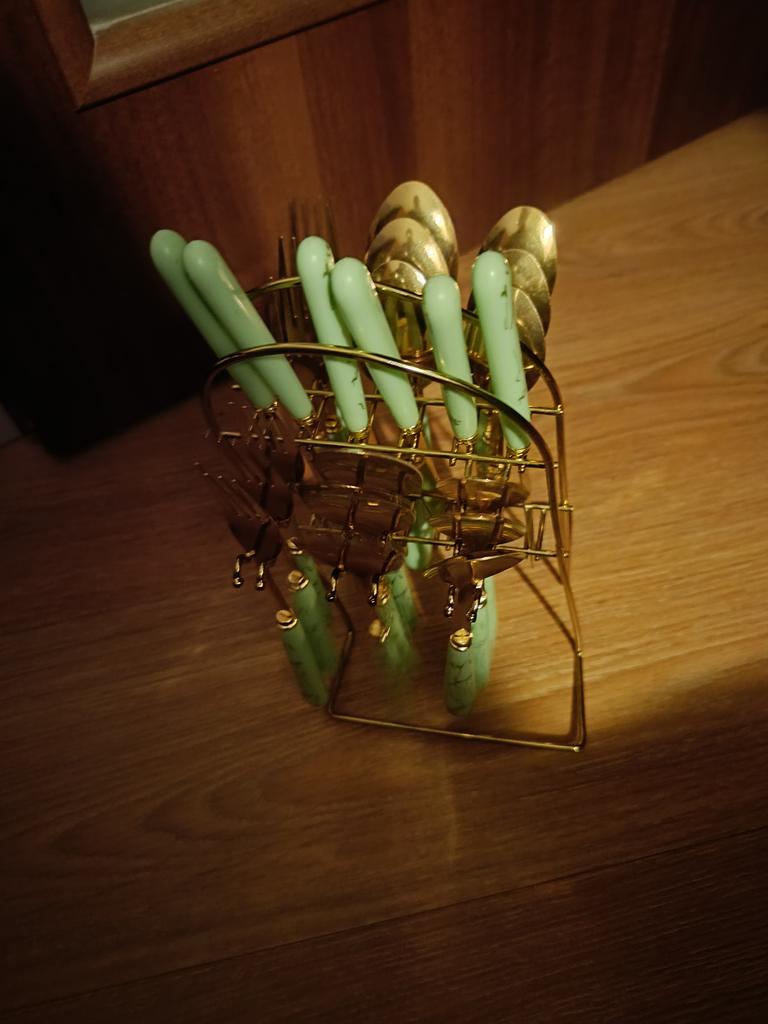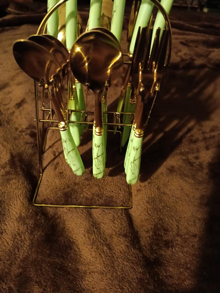24-teiliges Geschirrset aus Edelstahl, Keramikgriff, Muster, Kunststoffgriff, Westernmesser, Löffel und Gabel