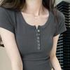 Baumwoll-T-Shirt mit Gewinde-Knopf für Damen, kurzärmlig, Sommer, neu, quadratischer Kragen, vielseitiges Outfit, schlankes Top, Basisshirt