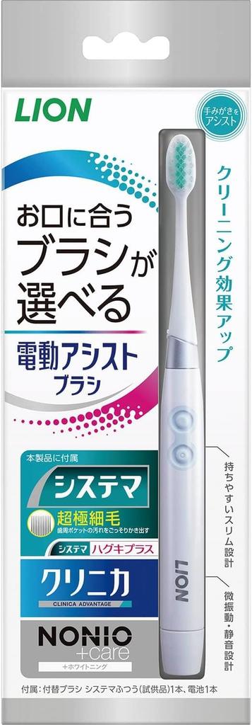 ●LION Electric Assist Brush ● Elektrische Zahnbürste ● Eine elektrische „Assist“-Bürste mit einer Bürste, die in Ihren Mund passt und Schallvibrationen nutzt, um das Zähneputzen mit der Hand zu unterstützen und so die Reinigungswirkung zu erhöhen. ● Schallschwingungen (ca. 9000 Mal/min) unterstützen die Schmutzentfernung. ● Dünner und kompakter Kopf, der sich leicht im Mund bewegen lässt. ●Der Griff ist schlank und leicht und lässt sich daher leicht polieren. ●Borstenhärte: Normale ●Hitzebeständige Temperatur: 80℃ [Set-Inhalt] ◆ Elektrischer Bürstenkörper: 1 Stk. ◆ Ersatzbürste Systema normal (Probe): 1 ◆ AAA-Alkalibatterie (Probe): 1 *Die mitgelieferte Batterie dient zum Testgebrauch. Da es zum Zeitpunkt der Herstellung und des Versands enthalten ist, kann die Lebensdauer verkürzt werden. [Wie benutzt man] (1) Tragen Sie eine angemessene Menge Zahnpasta auf die Zahnbürste auf, nehmen Sie sie in den Mund und schalten Sie dann den Schalter ein. (2) Putzen Sie Ihre Zähne mit gerade genug Kraft, um die Vibrationen der Borsten zu spüren, während Sie sie auf die gleiche Weise wie eine normale Zahnbürste bewegen. (3) Nach dem Zähneputzen schalten Sie den Schalter aus, während Sie die Zahnbürste im Mund behalten. (4) Nachdem Sie die Zahnbürste mit Wasser gewaschen und das Wasser abgelassen haben, bewahren Sie sie an einem gut belüfteten Ort auf. [Geschätzte Anzahl der Verwendungen] - Ungefähr 120 Mal mit einer AAA-Alkalibatterie