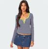 Kontrastierendes gestreiftes Strick Y2K Kleidung Damen Knopf Slim Formal Schulter T-Shirt