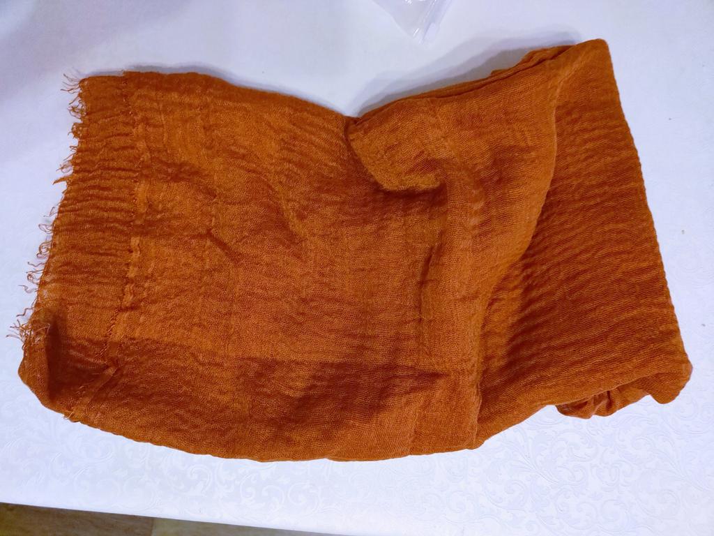 Die Farbe des Schals ist klassisches rotbraunes Terrakotta, satt und keineswegs orange wie auf dem Werbefoto, aber er hat mir gut gepasst. Danke!