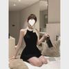 Ärmelloses schwarzes Damenkleid im französischen Stil - Sommerfee-Schleife, schmaler kurzer Rock