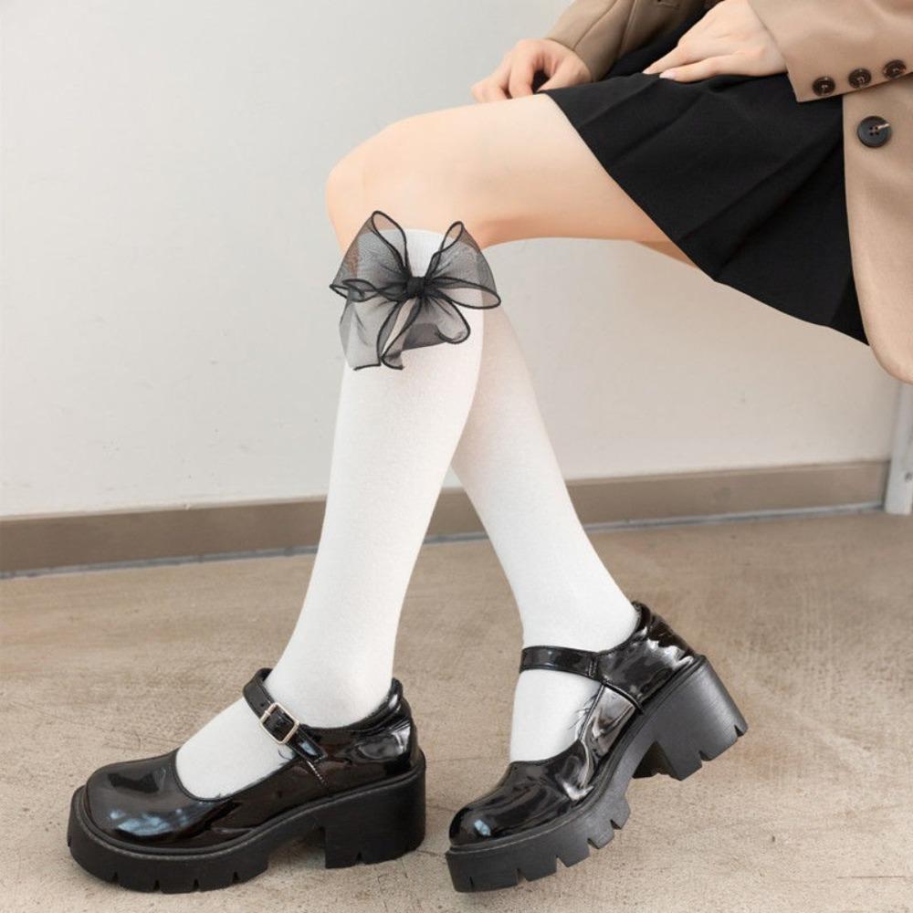 Schleife Röhrensocken Damen Frühling und Herbst Schwarz und Weiß JK Lolita Wadenstrümpfe Japanische Mädchen College-Stil Kniestrümpfe