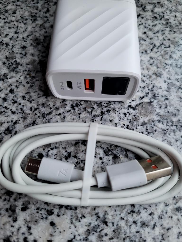 * USB Schnellladekabel mit USB-C - Anschluss * 💥𝗟𝗶𝗲𝗳𝗲𝗿𝘇𝗲𝗶𝘁 18 Tage bis nach Deutschland 💥𝗟𝗶𝗲𝗳𝗲𝗿𝘂𝗺𝗳𝗮𝗻𝗴 Im Lieferumfang enthalten ist 1 USB Ladekabel (bestehend aus Stecker und Ladekabel). Verfügbar ist das Gerät in Schwarz oder Weiß als US - Stecker oder EU - Stecker. Ich habe das Ladekabel in weiß für die EU-Variante bestellt. 💥𝗤𝘂𝗮𝗹𝗶𝘁ä𝘁 Der Stecker ist passend für deutsche Steckdosen. Es hat ein Display, wo unterschiedliche Stromanzeigen angezeigt werden . Außerdem kann man in den Stecker entweder einen gewöhnlichen USB-Anschluss reinstecken oder einen usb-c-anschluss, so wie es mittlerweile alle gängigen Geräte haben. Wenn man ein Gerät anschließt, werden einem die Watt- oder Amperezahl entsprechend angezeigt (so gut kenne ich mich leider mit den Maßeinheiten im Bereich Strom nicht aus). Es soll eigentlich ein Schnellladekabel sein. Wenn ich aber mein Handy lade, wird es nicht so schnell aufgeladen, wie mit meinem dafür mitgelieferten Kabel /Stecker für mein Samsung Smartphone. Zur Materialzusammensetzung : Kunststoff 💥𝗙𝗮𝘇𝗶𝘁 Sehr praktisches Schnellladekabel , wo man Kabel mit USB oder usb-c anschließen kann. Es können zeitgleich 2 Geräte mit diesem Stecker geladen werden. Super praktisch. 😉 ✌️ Man kann zwischen der US-Variante oder der Eu-variante wählen. Außerdem kann man sich noch zwischen den Farben Schwarz und Weiß entscheiden.