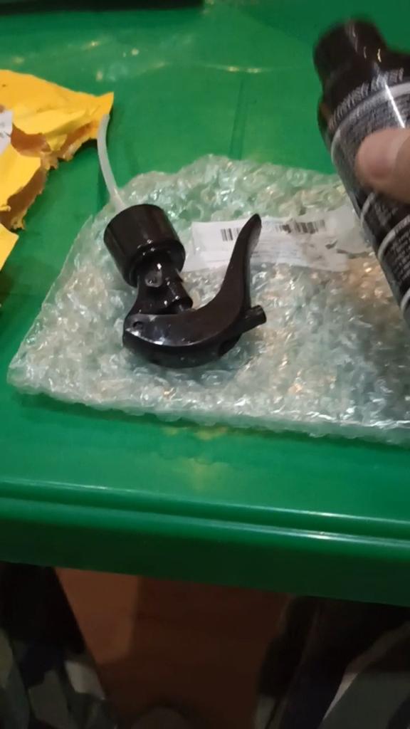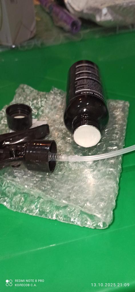 Die Sprühflasche ist abgebrochen, alles ist übergelaufen, die Verpackung ist Müll.
