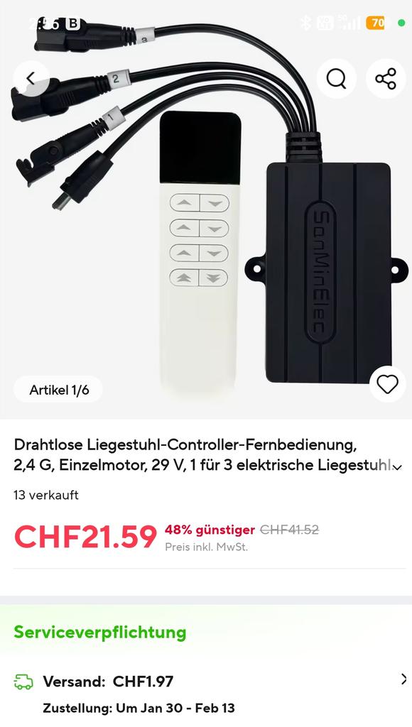 Gerät ist leider schon nach kurzer Zeit defekt. Schadenmeldung wurde bis heute nicht beantwortet. 23.01.2026 - Die Garantie Abwicklung lässt zu wünschen übrig. Obwohl ich ein Video geschickt habe auf dem klar zu sehen ist, dass das Steuer Gerät einen Kurzschluss beim Netzgerät 220/29 V verursacht. Das zweite Sofa funktioniert immer noch ohne Probleme mit dem Original Netzgerät! Ein Produktionsfehler beim Ersatz-Steuergerät - kann ja mal passieren. Aber dann ist die einfachste Garantie Erledigung: "Eine Gutschrift oder ein Gratis-Ersatz.....und das sollte dann bitte nicht Wochen dauern! Schade um das gute Produkt. Ich habe mich entschieden, das gleiche Produkt bei Alibaba zu bestellen - der einzige Unterschied ist der Preis CHF 21.57 - der halbe Preis! 26.01.26 - Es braucht ein bisschen Geduld, ein Video, noch einmal eine Beschreibung d s Fehlers und einen Support der eine Entscheidung treffen kann. Der ganze Kaufbetrag wurde gutgeschrieben. Vielen Dank