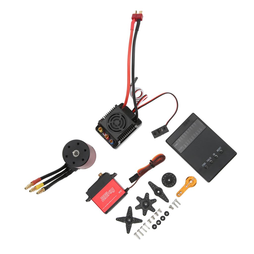 1 x Motor1 x ESC1 x Programming Card1 x Servo4 x Plastic Servo Arm1 x Metal Servo Arm7 x Screw4 x Rubber Shock Absorption4 x Screw Barrel1 x ManualProfessional Design: The RC brushless motor ESC combination features a 4 pole 12 slot high torque motor design to provide you with higher performance.
