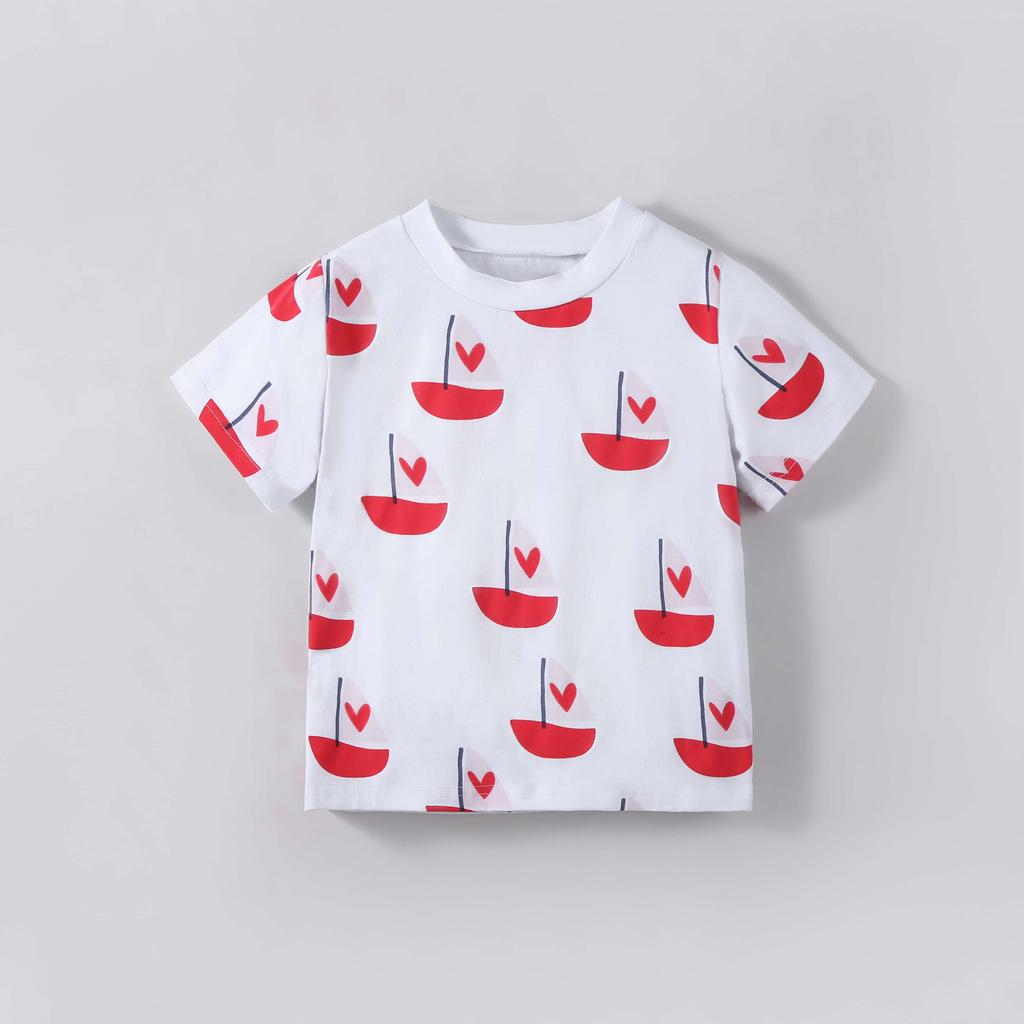 2-7 Jahre Mädchen Baumwollmischung Oberteile Kleinkind Freizeit Kinder T-Shirt Niedlicher Herz Segelboot Druck Sommer Kinder Rundhals Kurzarm T-Shirts