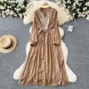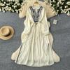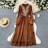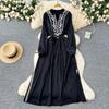 Vintage Maxikleid für Damen, Stickerei, V-Ausschnitt, lange Ärmel, Damenkleid, Schnürung, hohe Taille, elegante Kleider
