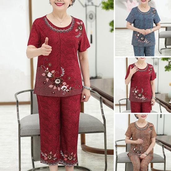 Frühling Sommer Eis Seide Rundhals Damen Kurzarm + Hose Freizeit Sport Zweiteiliges Set