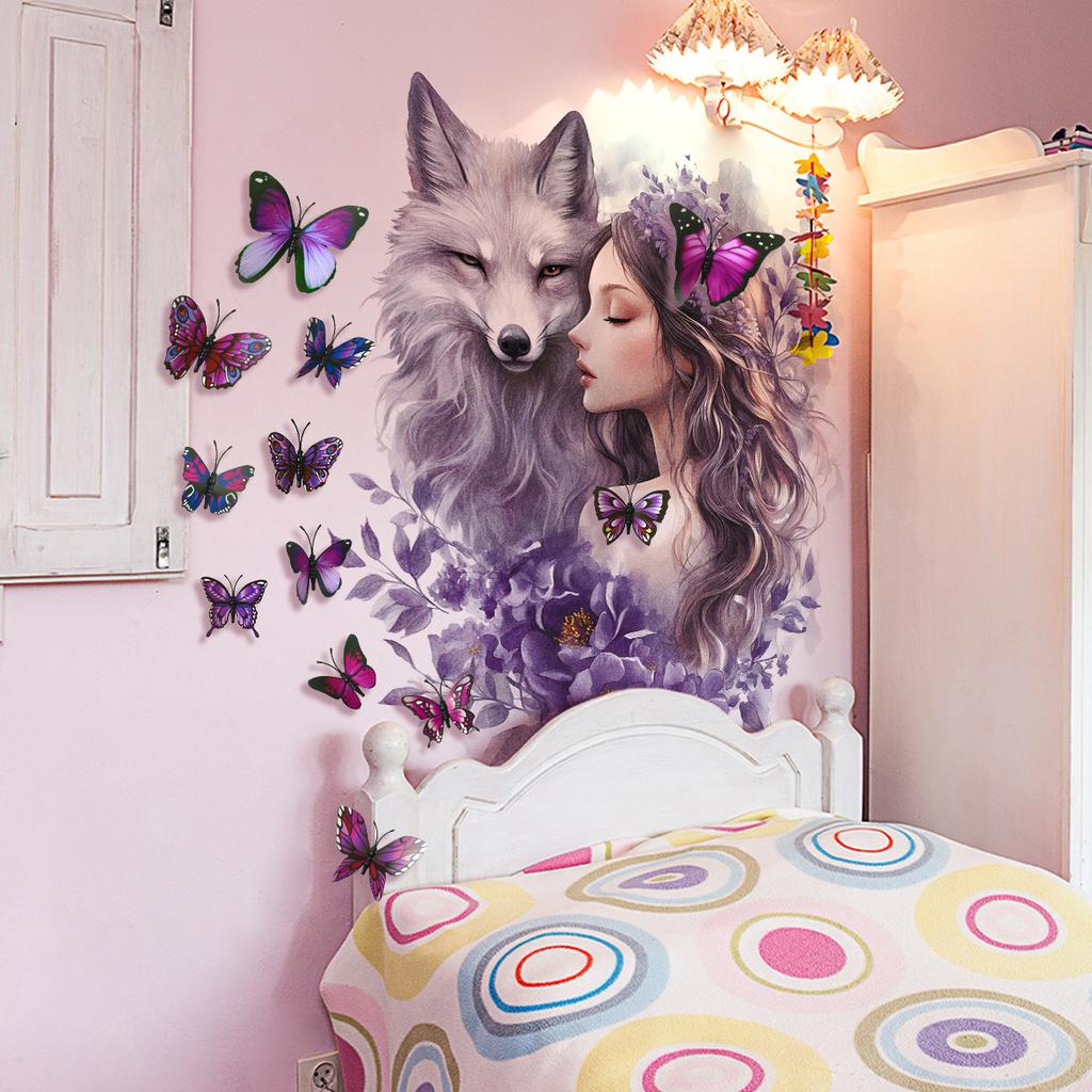 3D Wolf Wandsticker Schmetterling Blumen Fee Wandkunst Aufkleber für Mädchen Schlafzimmer Baby Kinderzimmer Dekor
