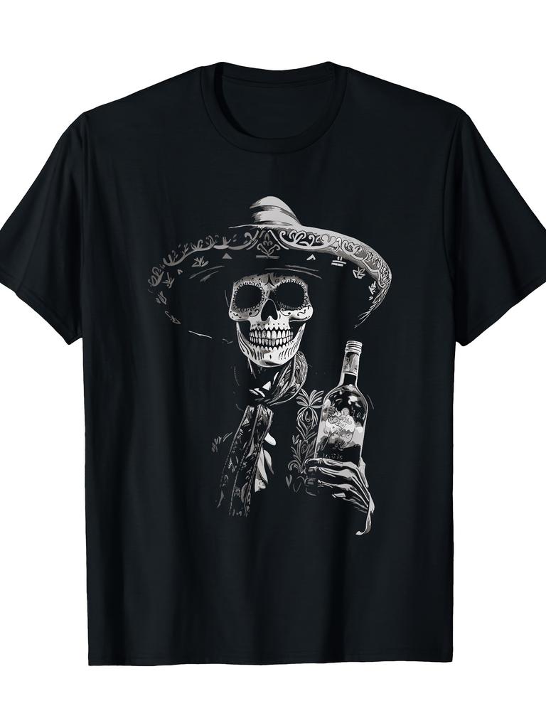 Maschinenwaschbares Oberteil| Herren Vintage Skelett Tequila Grafik T-Shirt - Dia De Los Muertos, , Kurzarm, Rundhals
