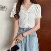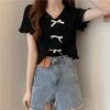 Mode Holzohr-Kante Fliege V-Ausschnitt Kurzarm T-Shirt Strickshirt Damen Locker Dünn Vielseitiges Oberteil Tide Lässig Essentiell Slim Fit Pullover T-Shirts