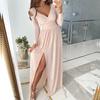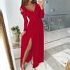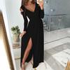 IHUASU Herbst und Winter Langarm V-Ausschnitt Einfarbig Unter dem Gabelrock Kleid Damen