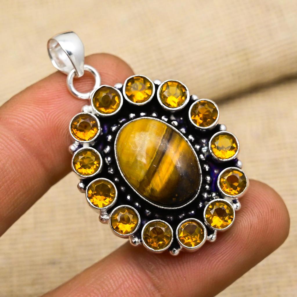 Tigerauge, Citrin Edelsteinschmuck 925 Sterlingsilber Handgefertigter Anhänger