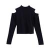 Damen Schwarze Off-Shoulder Langarm Crop Tops - Herbst/Winter Baumwolle Mode T-Shirts mit hohem Kragen
