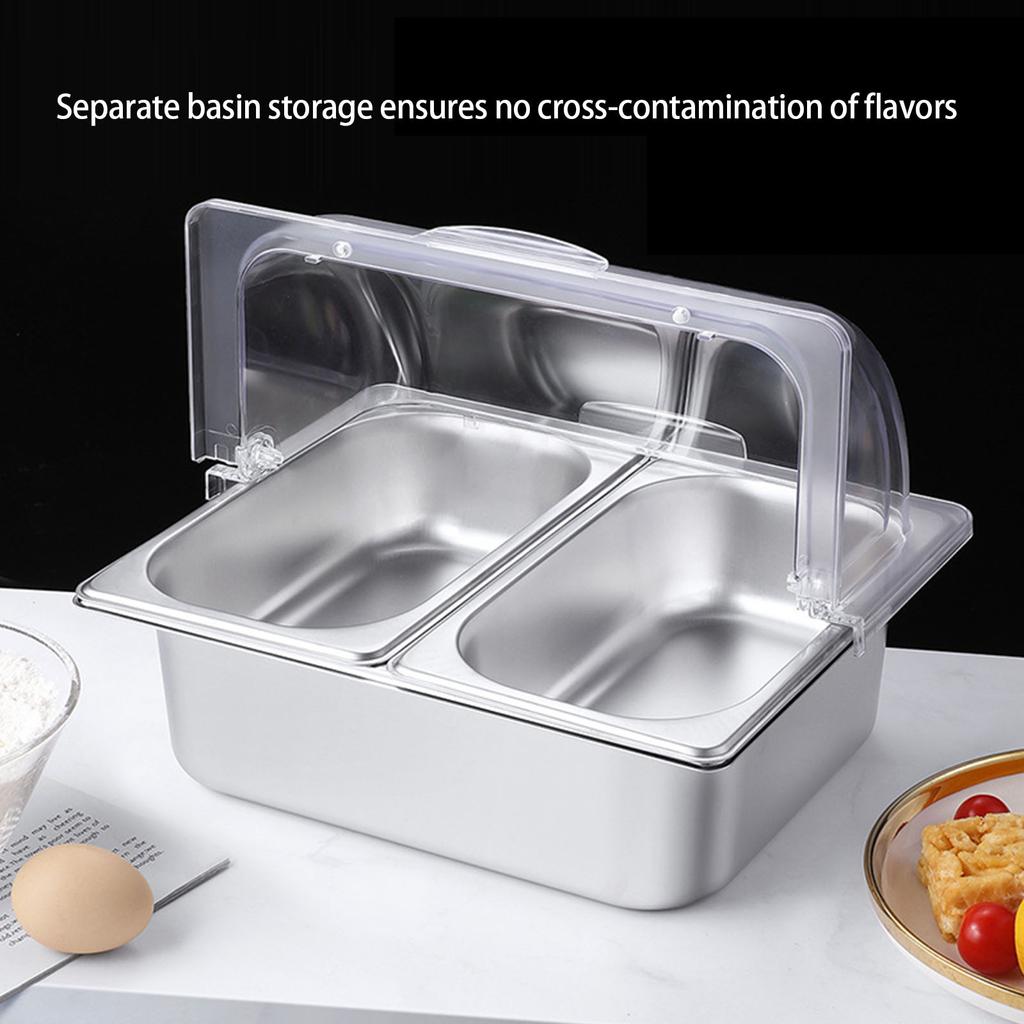 Die Konstruktion aus Edelstahl mit einer transparenten Rolldeckelabdeckung gewährleistet Frische und Sichtbarkeit der Lebensmittel, ideal für Theken-Lebensmittel-Servierbehälter in Großküchen oder Heim-Buffets.