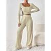 Women's Fashion Knitted Ribbed Wide-Leg Pants and Round Neck Long-Sleeve Top Suit