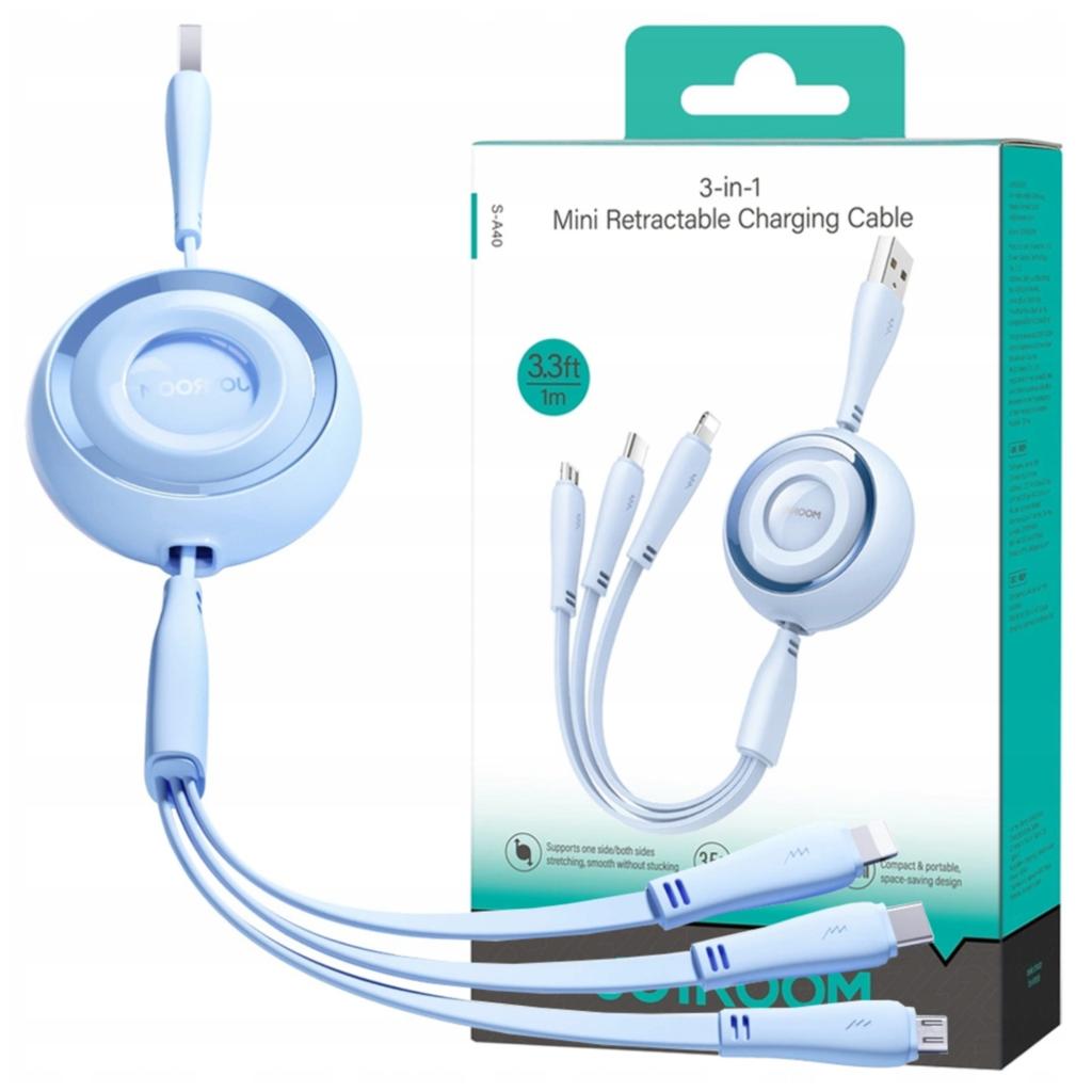Das Kabel Joyroom S-A40 ist mit drei verschiedenen Anschlüssen ausgestattet — USB-C, Lightning und Micro-USB, was das Aufladen fast jedes Geräts ermöglicht.. Mit seiner Hilfe laden Sie die meisten Ihrer Geräte auf – von Smartphones über Tablets bis hin zu Unterhaltungselektronik.