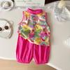 Sommer-Set für Mädchen Koreanisch bedruckt Ärmellos Rundhals Anzug Hemd und Hose Set Lässiges Zweiteiler-Set für Mädchen
