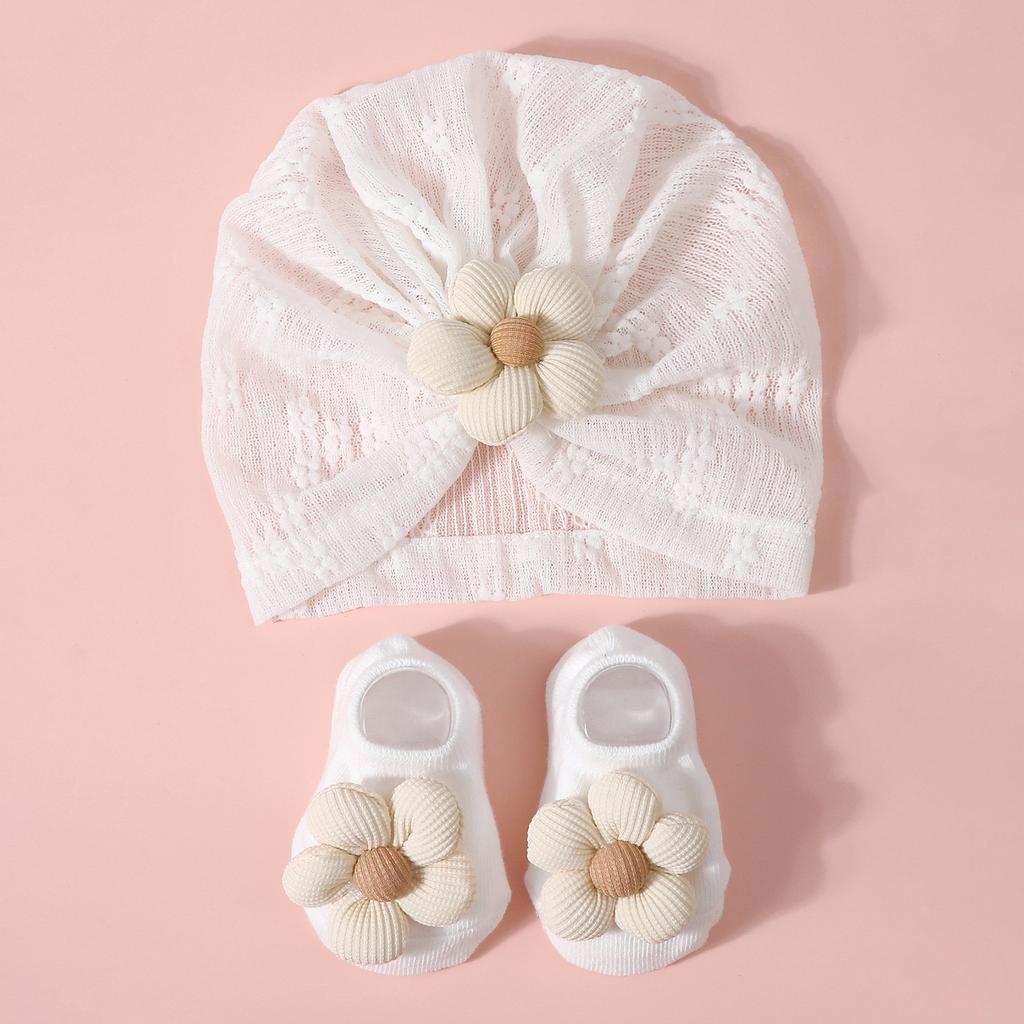 Babymütze, atmungsaktive Stoffe, mit Blumen, schadet Babyhaaren nicht, und Socken-Set; Kann nicht nur guten Schutz für den Kopf des Babys bieten, sondern auch das Kind leicht zum Mittelpunkt der Aufmerksamkeit machen