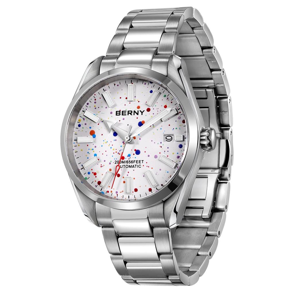 BERNY Automatikuhr für 200M Wasserdicht Superleuchtend Mechanisch Vollständig Edelstahl Analog Saphir Kalender Inklusive Herren, Herrenuhr, Silber, Uhr,