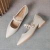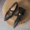 Professionelle schwarze kleine Lederschuhe Damenstil Jahr spitze Zehenpartie flacher Ausschnitt dicker Absatz Einzelne Schuhe Damen