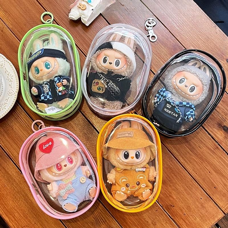 Transparente Schutzhülle Organizer-Box für 15-17cm Labubu Puppen Outdoor-Ausstellungstasche mit Schlüsselanhänger Puppenzubehör