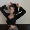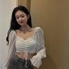 Chiffon-Bluse, sexy, schulterfrei, langärmelig, Kordelzug, kurzes Top, französisches V-Ausschnitt, hohe Taille, abgeschnittenes Nabel-Shirt, solide, modische Y2k-Tops