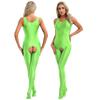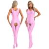 Damen Glatt Vollständige Abdeckung Offener Schritt Bodysuit U-Ausschnitt Ärmellos Fuß-Jumpsuit Glänzend Dehnbar Einfarbig Unitard Nachtwäsche