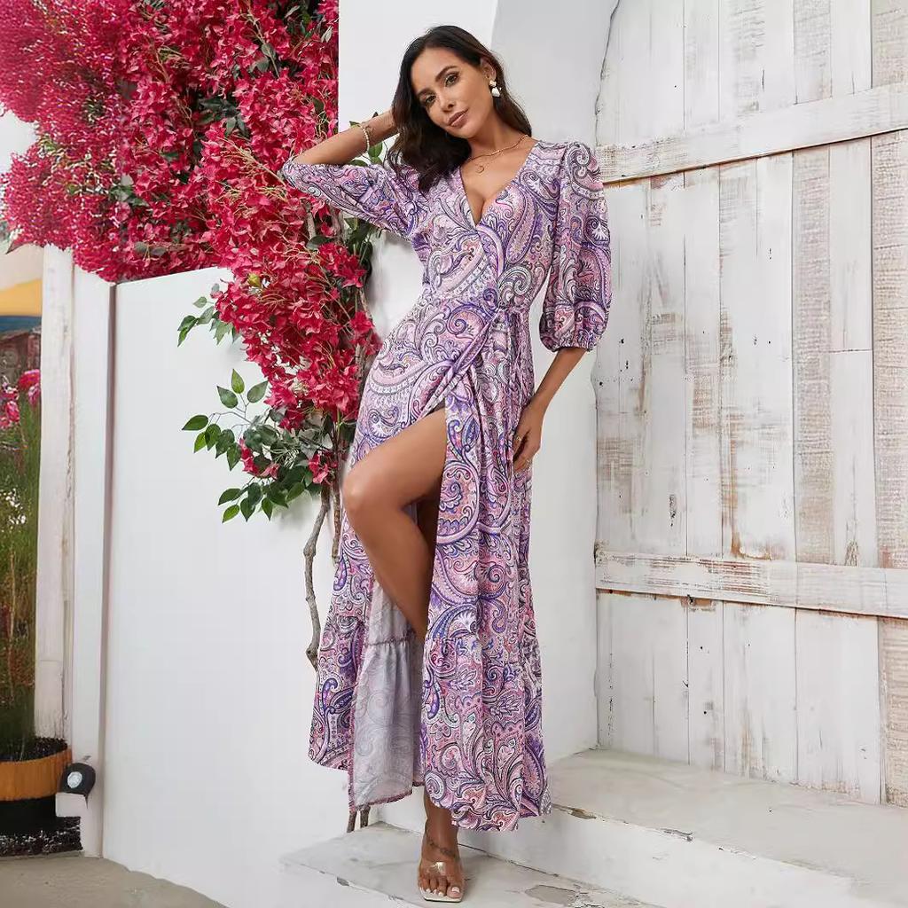Damenkleid, lockeres Trägerkleid mit V-Ausschnitt, Puffärmeln, legeres Partykleid, Kleider mit botanischem Blumendruck, Urlaubskleider