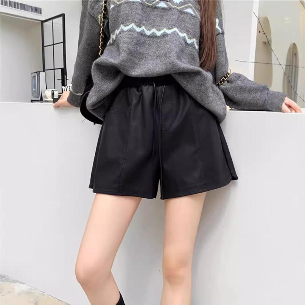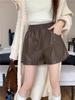 Women's High-Waisted Brown Leather Shorts - Retro, Slimming, Versatile Casual Wear for Autumn and Winter.