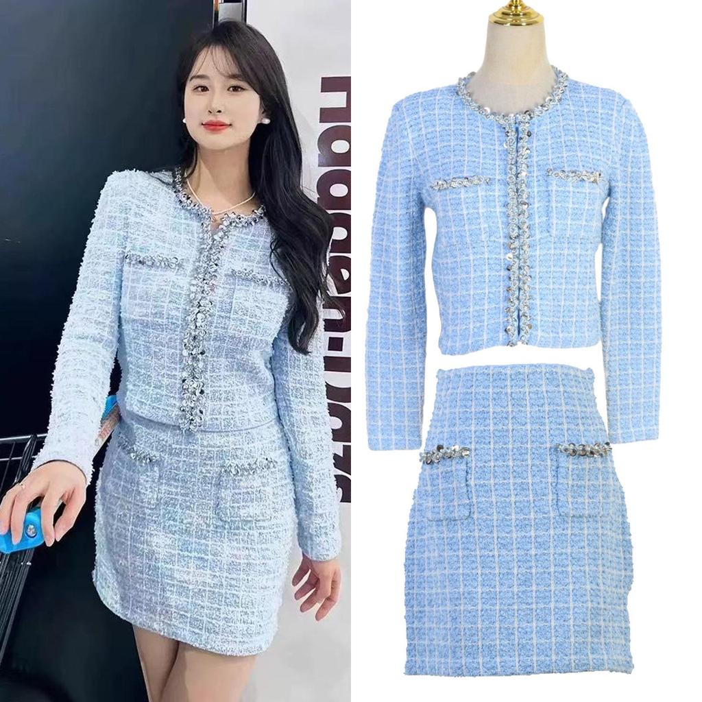 Schickes, französisch inspiriertes Strickjacken- und Bodycon-Midirock-Set mit Diamanten