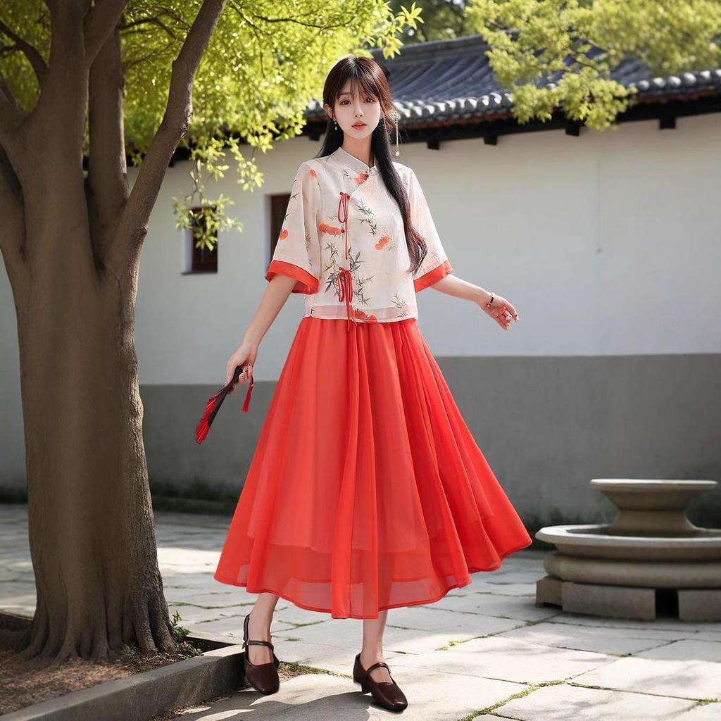 This elegant two-piece set combines the charm of traditional Chinese attire with a modern twist. Crafted entirely from soft polyester, it offers both comfort and style. The outfit includes a beautifully designed Tang suit top and a retro-inspired cheongsam skirt, perfect for making a statement at cultural events or themed occasions. With its intricate detailing and vibrant colors, this set effortlessly captures the essence of classic Chinese fashion in a contemporary way.