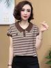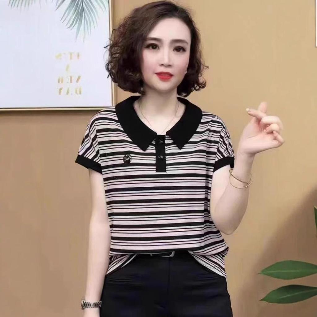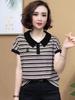 Sommer Besticktes Gestreiftes Peter Pan Kragen T-Shirt für Frauen mittleren Alters und ältere Frauen - Kurzarm